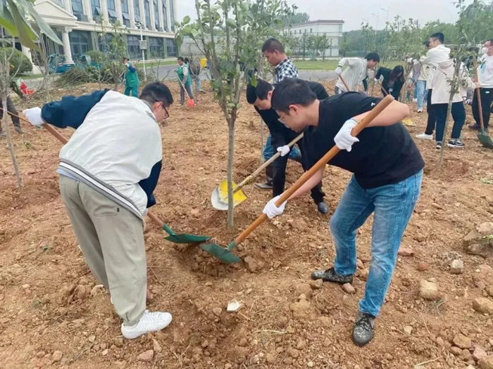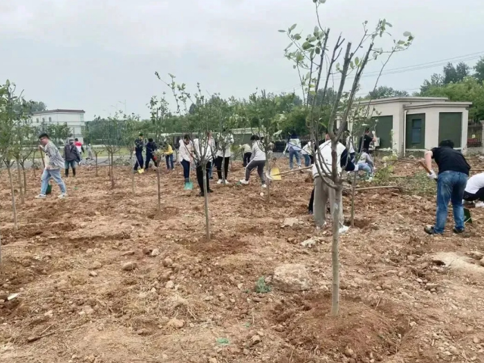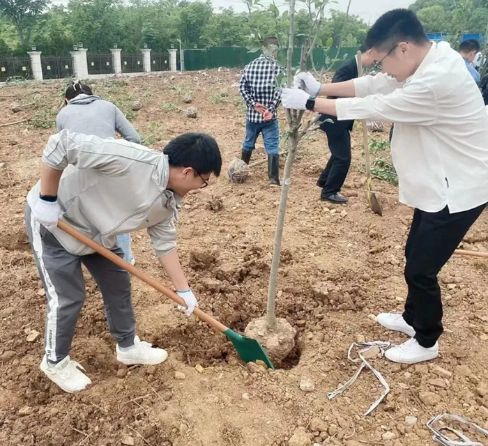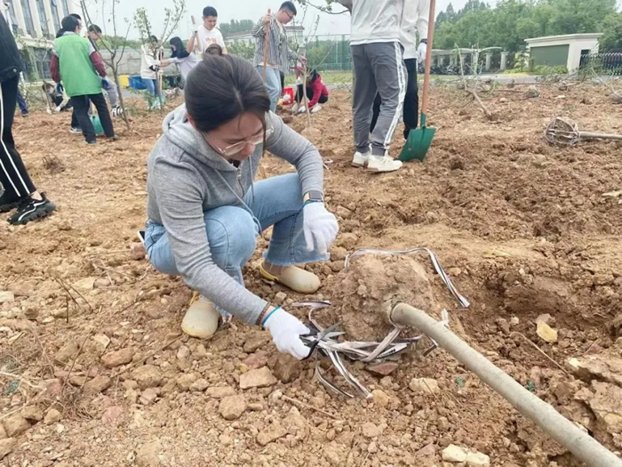 除土球布條、挖坑、扶樹(shù)、填土、檢查調整......紙上得來(lái)終覺(jué)淺,覺(jué)知此事要躬行??油诘没蛱罨蛱珳\,埋樹(shù)根時(shí)或太松或太實(shí),凡此種種細節,都會(huì )影響樹(shù)苗成活率,大家也虛心聽(tīng)從綠化師傅們的意見(jiàn),耐心調整,并很快得心應手起來(lái)。