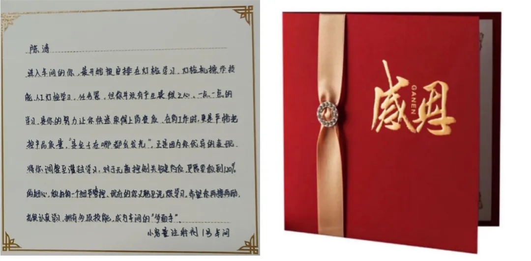 感謝卡:進(jìn)入車(chē)間的你,最開(kāi)始被安排在燈檢學(xué)習,燈檢機操作技能、人工燈檢學(xué)習,任務(wù)緊,但你并沒(méi)有產(chǎn)生畏懼之心,一點(diǎn)一點(diǎn)的學(xué)習。是你的努力讓你快速取得上崗資質(zhì)。在崗工作時(shí),更是嚴格把控產(chǎn)品質(zhì)量?!笆墙鹱釉谀亩紩?huì )發(fā)光”,正是因為你優(yōu)異的表現,將你調整至灌封學(xué)習,對于無(wú)菌控制關(guān)鍵崗位,更需要做到120%的細心,做好每一個(gè)細節管控?,F在的你又轉至洗烘學(xué)習,希望你再接再勵,扎實(shí)認真學(xué)習,擁有多項技能,成為車(chē)間“多面手”。
