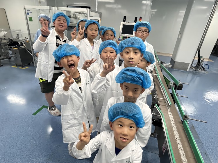 緊接著(zhù)孩子們來(lái)到了小容量注射劑1號車(chē)間。在進(jìn)入生產(chǎn)區的剎那,透過(guò)巨大的玻璃展窗,孩子們發(fā)出陣陣驚嘆——儲水罐猶如高大威猛的巨人,佇立在光亮整潔的制水間內。注射液的誕生之路便從這里開(kāi)始。在滅菌間內,孩子們對巨大的鐵柜子充滿(mǎn)了好奇,它就是飽和蒸汽滅菌柜,是藥支“蒸桑拿”的地方。孩子們在這里學(xué)習到了溫度與微生物之間的親密關(guān)系。在燈檢間內,巨大的星輪圓盤(pán)與隊列整齊的藥支們訴說(shuō)著(zhù)質(zhì)量第一的故事。最后,在包裝間內,從分托入托機到裝箱機,藥支們陸續穿上漂亮的服裝,成功誕生為完整的產(chǎn)品。孩子們了解到,每一支注射劑的誕生,都是科技與智慧的結晶,是保護人類(lèi)健康的超級英雄。