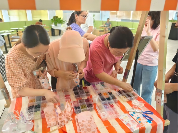彩珠斑斕,猶如繁星點(diǎn)點(diǎn),在場(chǎng)的海陵員工精心挑選了自己心儀的珠子,以靈巧的雙手,將這些絢爛的彩珠編織成一條條獨一無(wú)二的手鏈。