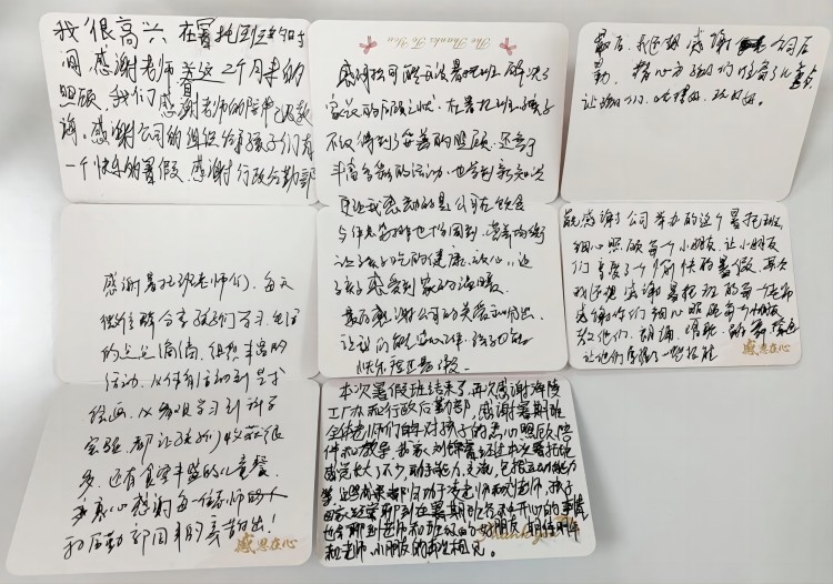 現場(chǎng)每一位家長(cháng)都手寫(xiě)了對暑托班的感謝信。有的家長(cháng)情感細膩,賦詩(shī)一首,用優(yōu)美的詩(shī)句表達了對暑托班深深的感激之情;有的家長(cháng)則先打好了草稿,再滿(mǎn)滿(mǎn)當當地謄寫(xiě)到卡片上,每一個(gè)字都凝聚著(zhù)對暑托班老師及工作人員的敬意與感謝。這些感謝信,如同一幅幅溫馨的畫(huà)面,展現了家長(cháng)與暑托班之間深厚的情感紐帶。