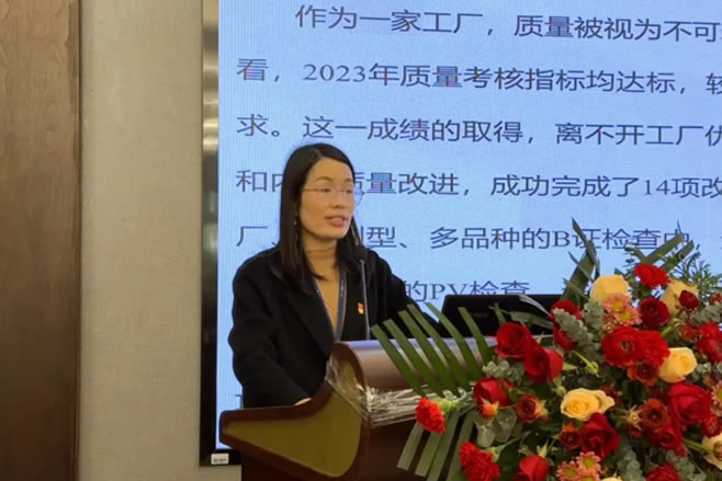 會(huì )議伊始,海陵黨支部書(shū)記、海陵工廠(chǎng)廠(chǎng)長(cháng)助理李靜做出以《踔厲奮發(fā)新征程,終身成長(cháng)再起航》為題的海陵藥業(yè)2023年終工作報告??偨Y了海陵人2023年展現出的拼搏精神和奮斗姿態(tài),以及取得的來(lái)之不易的成果,更為海陵明確了2024年的努力方向。