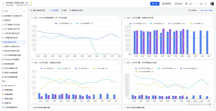 最終完成的儀表盤(pán),改變了廠(chǎng)區能耗數據收集困難、分析困難、及時(shí)性低的問(wèn)題。通過(guò)儀表盤(pán)這一新工具將原本獨立的數據整合起來(lái),橫可看每月數據變化,縱可查往年同比增長(cháng),小可看單體設備耗能,大可覽全廠(chǎng)能耗起伏。在海陵實(shí)現能源精細化管理、節能減排和成本控制目標的道路上給予了幫助。項鈺茹還帶著(zhù)這個(gè)儀表盤(pán)參與了9月20日的海陵飛書(shū)案例大賽,取得了二等獎的好成績(jì)。