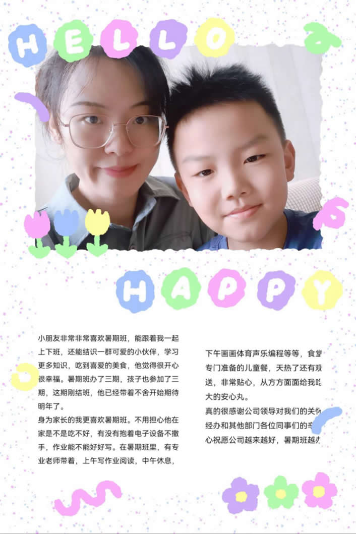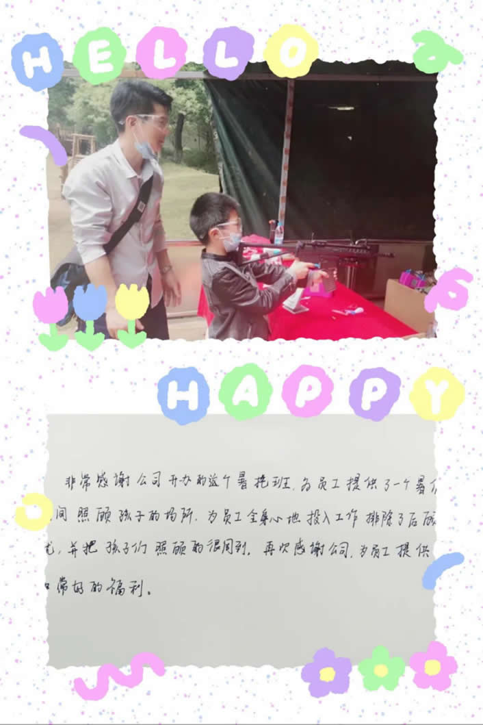 非常感謝公司開(kāi)辦的這個(gè)暑托班,為員工提供了一個(gè)暑假期間照顧孩子的場(chǎng)所,為員工全身心地投入工作排除了后顧之憂(yōu),并把孩子們照顧的很周到,再次感謝公司,為員工提供了非常好的福利。