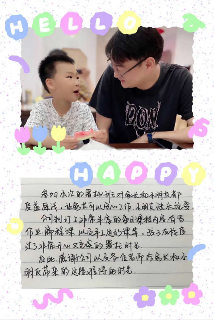 參加本次的暑托班對家長(cháng)和小朋友都受益匪淺,讓家長(cháng)可以安心工作,小朋友快樂(lè )玩耍。公司制訂了非常豐富的每日課程內容,有寫(xiě)作業(yè)、編程課以及手工運動(dòng)課等。孩子在校度過(guò)了非常開(kāi)心又充實(shí)的暑托時(shí)光。在此,感謝公司以及各位老師給家長(cháng)和小朋友帶來(lái)的這段難得的時(shí)光。