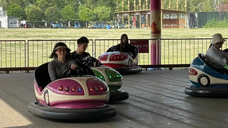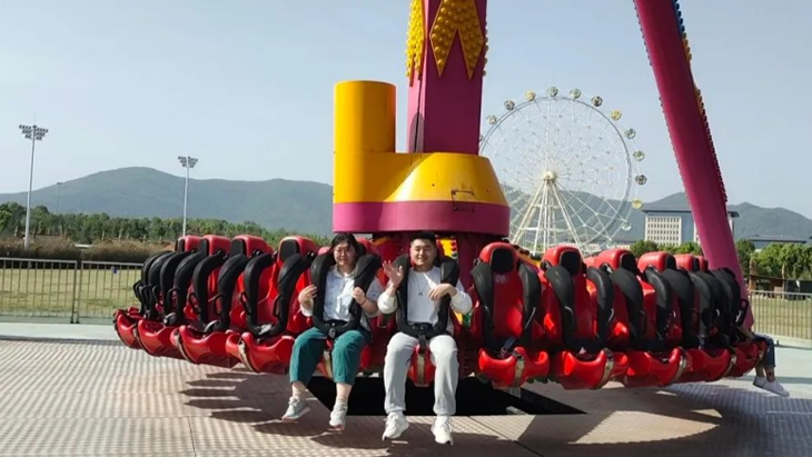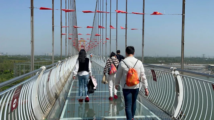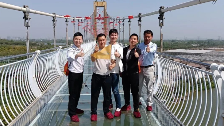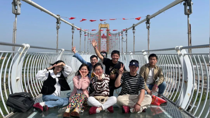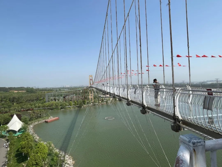 午后升溫的烈日下,完成競賽的成員三五成群的來(lái)到游樂(lè )設施區域。最火爆的項目非“鵲橋”——高空玻璃棧道莫屬。