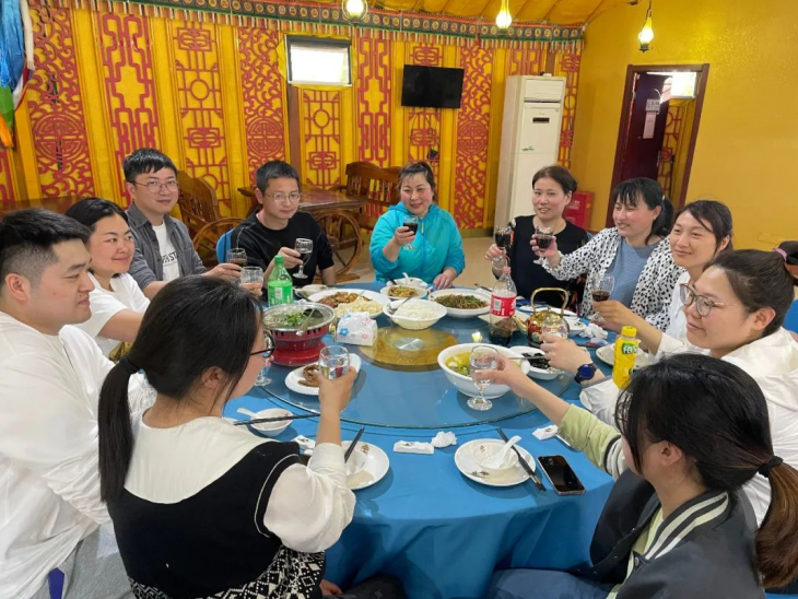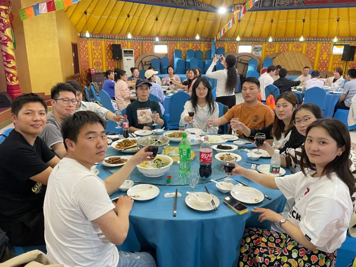 結束頒獎后,一行人談笑風(fēng)生地步行前往“蒙古大營(yíng)”,走進(jìn)用餐區,一個(gè)個(gè)或大或小的蒙古包映入眼簾,落日余暉下的風(fēng)景讓人深感民族特色。大家圍坐在桌旁,享用美味晚餐,幸運的我們還觀(guān)賞到蒙古族歌曲、舞蹈、和馬頭琴的驚喜表演。