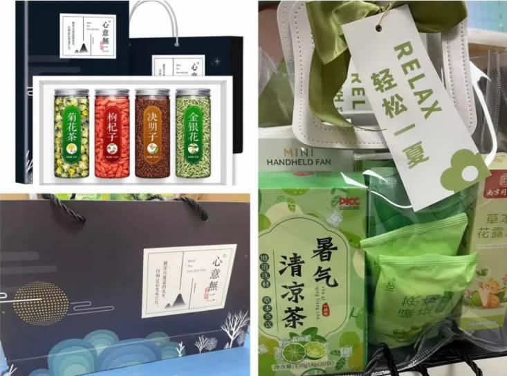 每位現場(chǎng)的高溫作業(yè)人員都收到了一份高溫防暑禮包:蒸汽眼罩、濕巾、防蚊膏、暑氣清涼茶、冰涼貼、風(fēng)扇、花露水;以及一份夏日養生茶禮盒:菊花茶、枸杞子、決明子、金銀花。