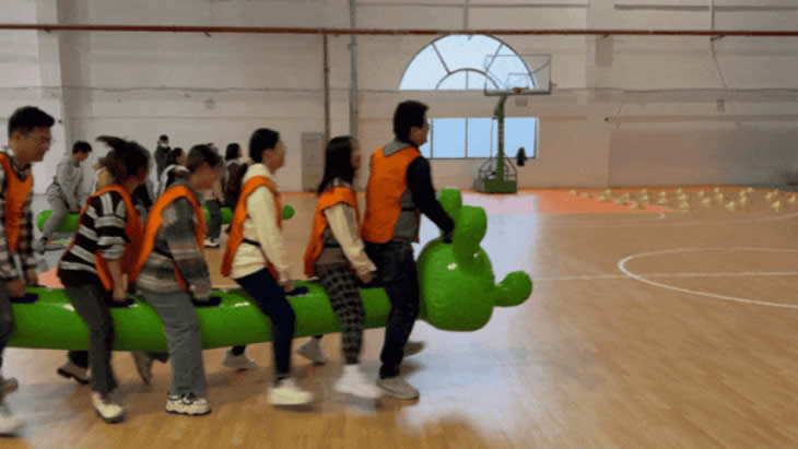 隨著(zhù)響亮的口哨聲,活動(dòng)正式開(kāi)始!第一個(gè)項目是“毛毛蟲(chóng)大比拼”,四支隊伍都領(lǐng)到了一只毛毛蟲(chóng)作為團隊“坐騎”,看似簡(jiǎn)單,實(shí)則不易。練習以后,大家都看出了項目的關(guān)鍵:考驗團隊協(xié)作力?!白笥易蟆薄耙欢弧备麝牳髯院爸?zhù)口號步伐一致地奔赴終點(diǎn)!